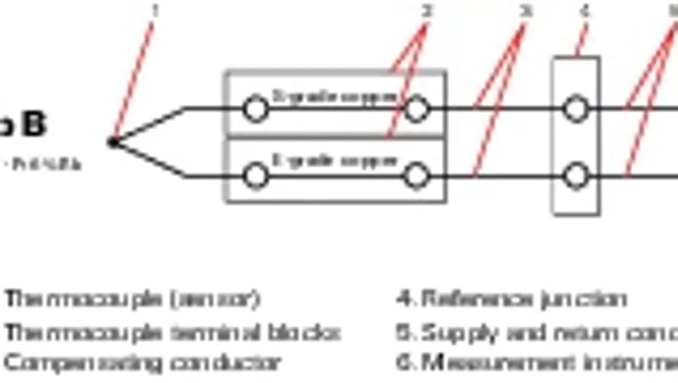 A mérési kapcsolásban látható termoelem sorkapcsok révén a termoelektromos feszültség termoelektromos átvitele végezhető el a termoelemről a referencia leágazáshoz és a jelzőegységhez a kompenzáló vezetéken keresztül. Termoelem sorkapcsok szükségesek a hőmérsékletmérő kapcsolás kialakításához.